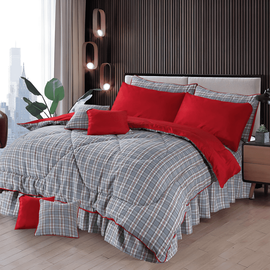 Package Deal: 1x King Size Printed Bedspread with 3-sided Frill, 2x King Size Printed Pillow Covers, 2x King Size Plain Pillow Covers, 2x King Size Printed Cushion Covers, 2x King Size Plain Cushion Covers, 1x King Size Printed Razai(Filled).