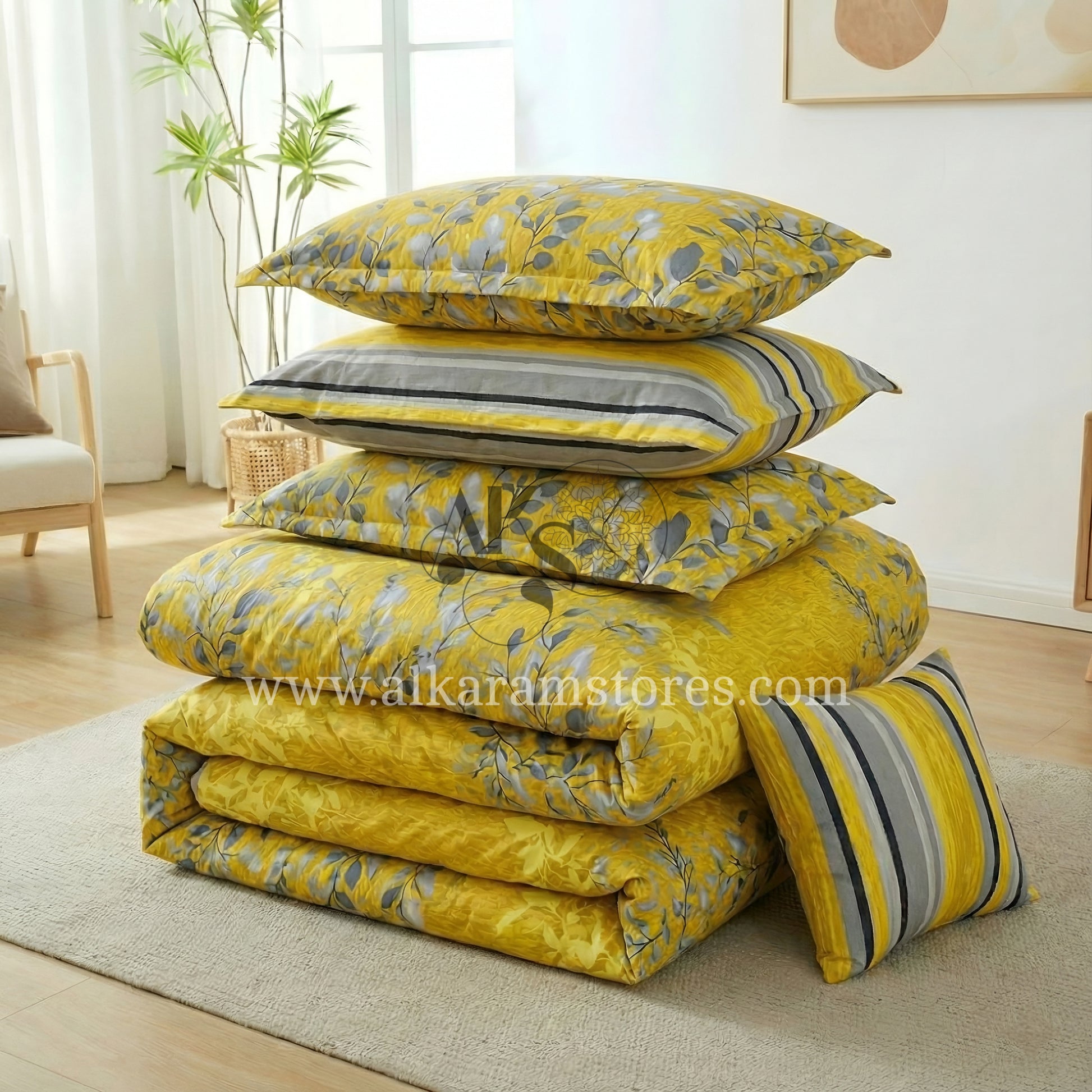 Package Deal: 1x King Size Comforter, 1x King Size Bedsheet, 2 King Size Pillow Covers, 2x King Size Quilted Pillow Covers, 1x Quilted Cushion Cover.