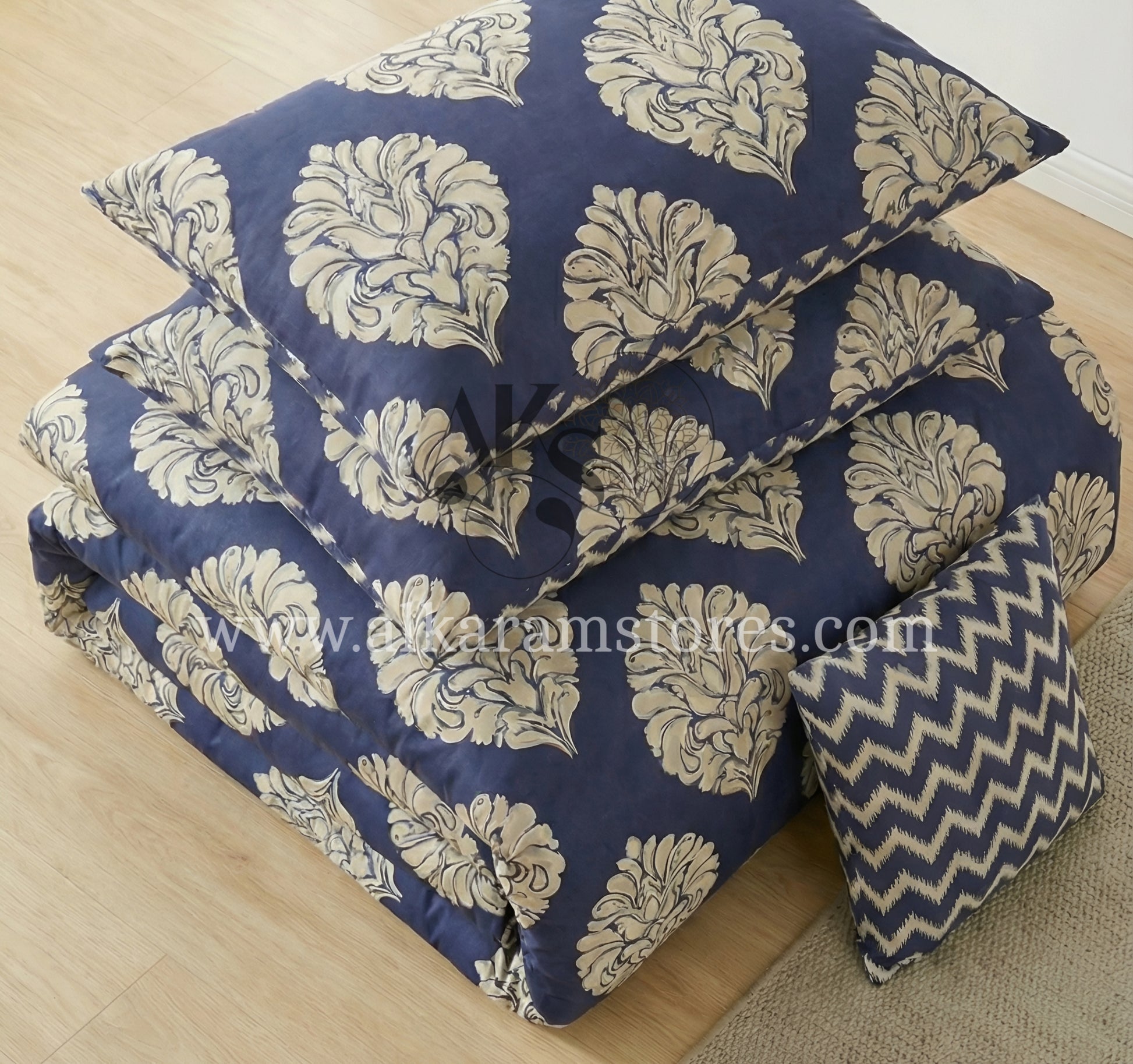 Package Deal: 1x King Size Comforter, 1x King Size Bedsheet, 2 King Size Pillow Covers, 2x King Size Quilted Pillow Covers, 1x Quilted Cushion Cover.