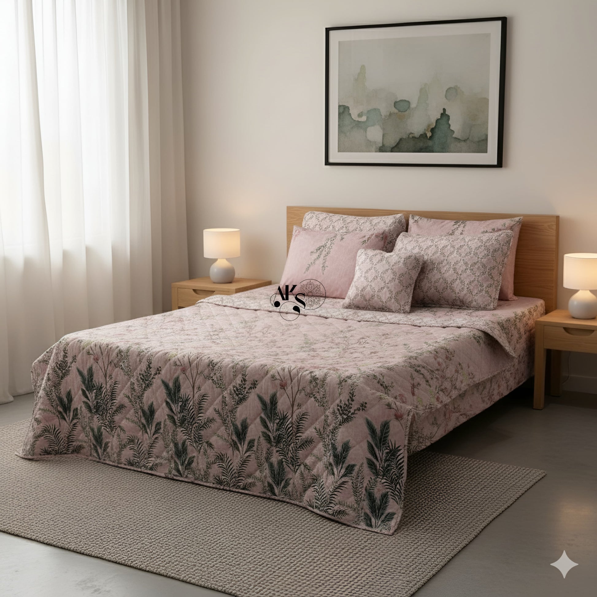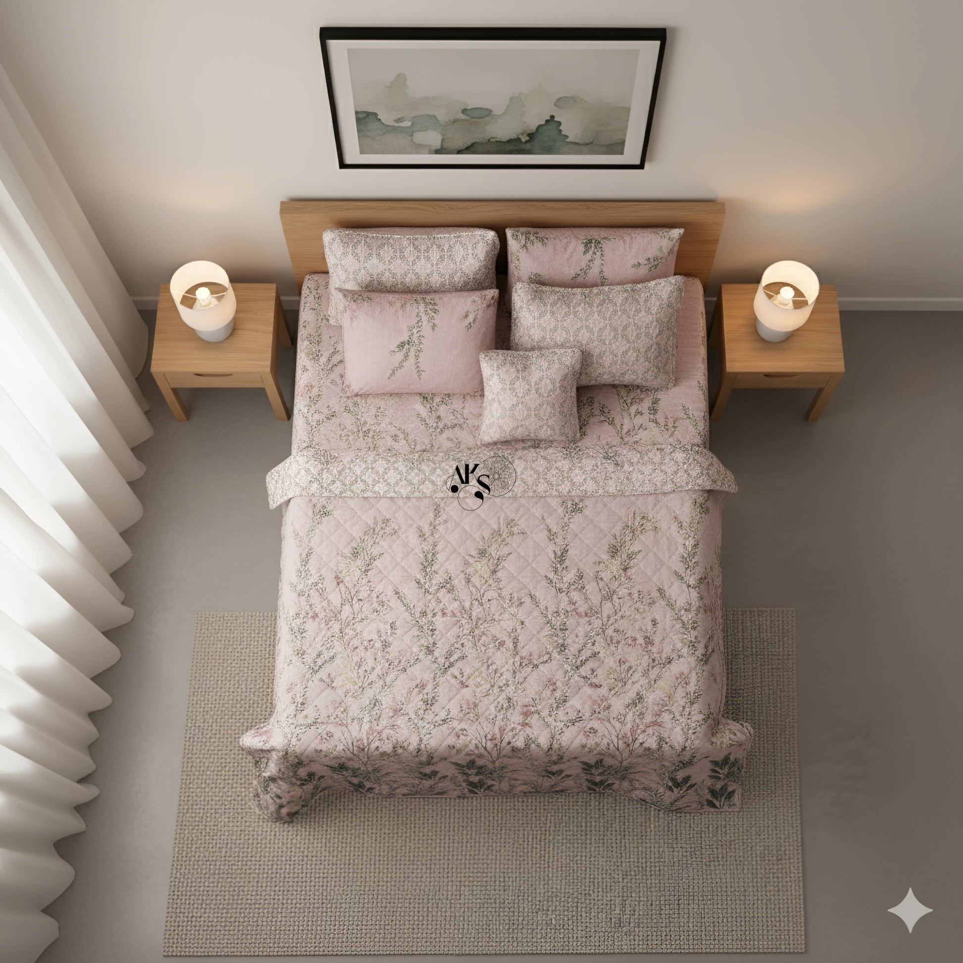 Package Deal: 1x King Size Comforter, 1x King Size Bedsheet, 2 King Size Pillow Covers, 2x King Size Quilted Pillow Covers, 1x Quilted Cushion Cover.