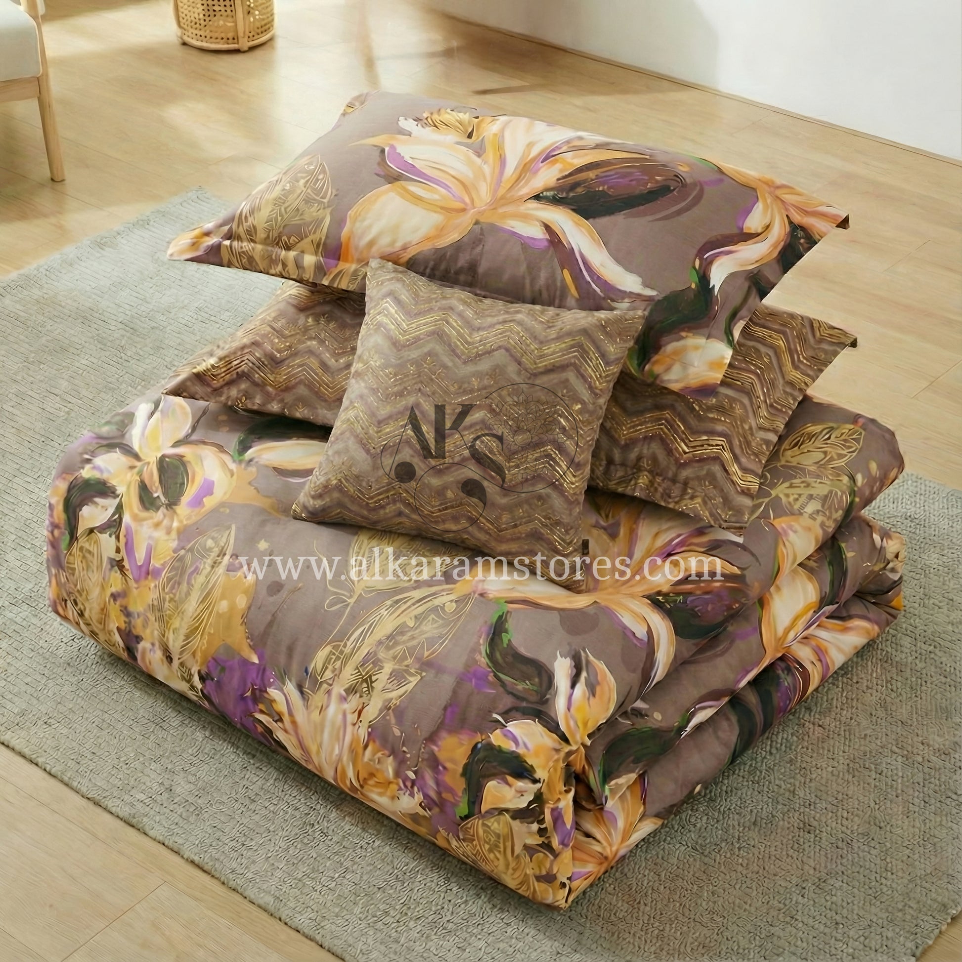 Package Deal: 1x King Size Comforter, 1x King Size Bedsheet, 2 King Size Pillow Covers, 2x King Size Quilted Pillow Covers, 1x Quilted Cushion Cover.